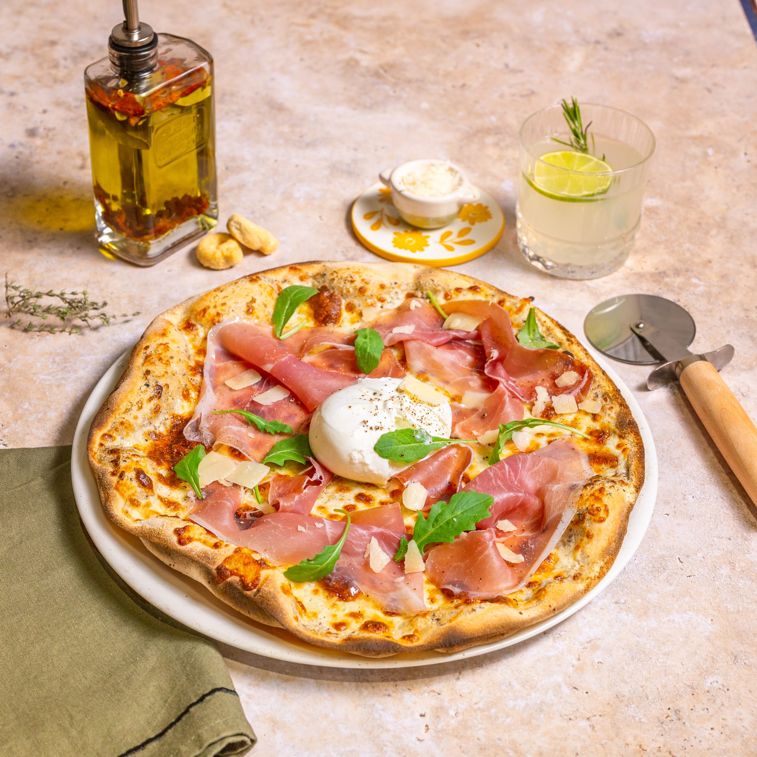 Crème fraîche, mozzarella, crème de truffe.Après cuisson : Burrata des Pouilles, jambon cru affiné italien, copeaux de parmigiano reggiano D.O.P., roquette.