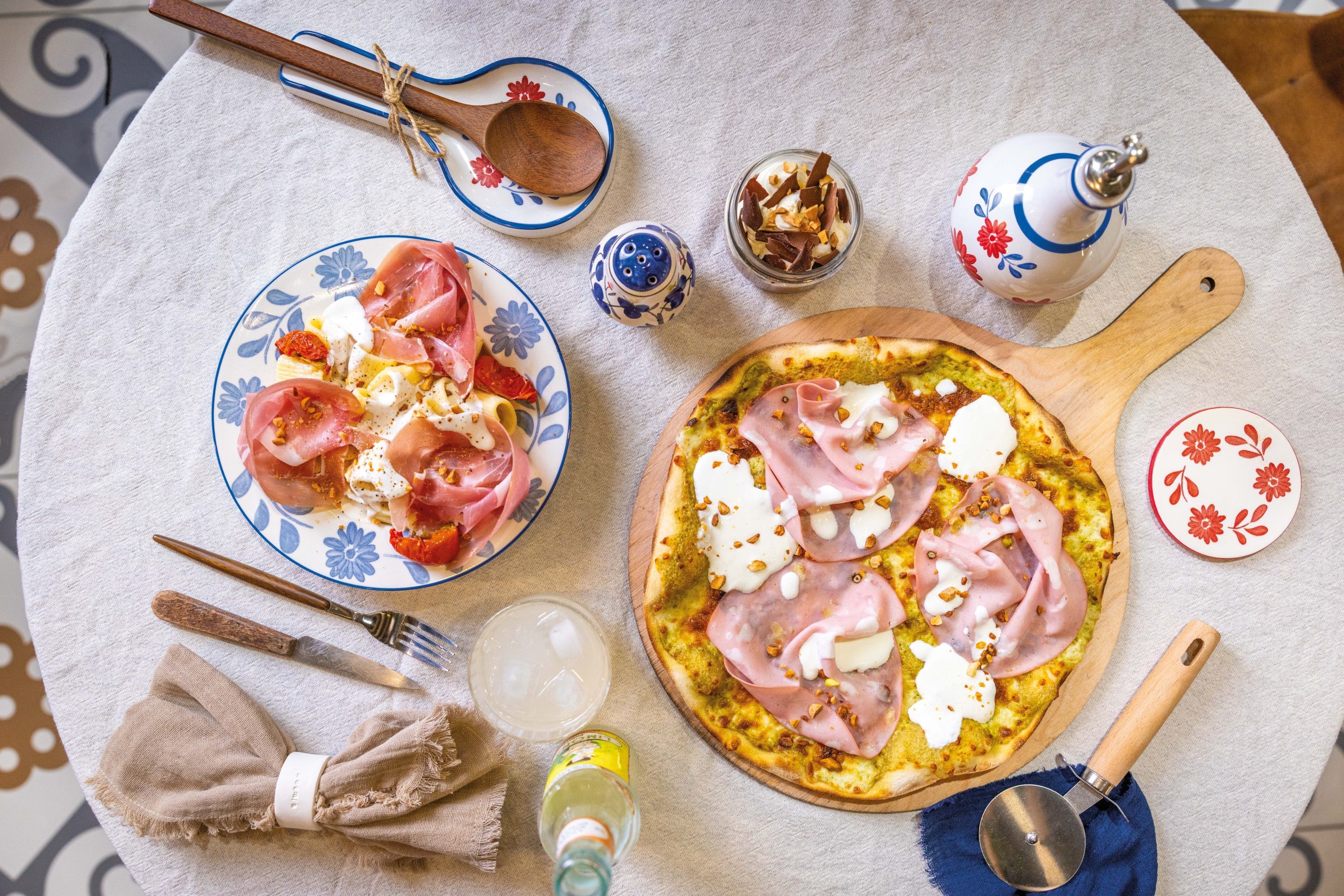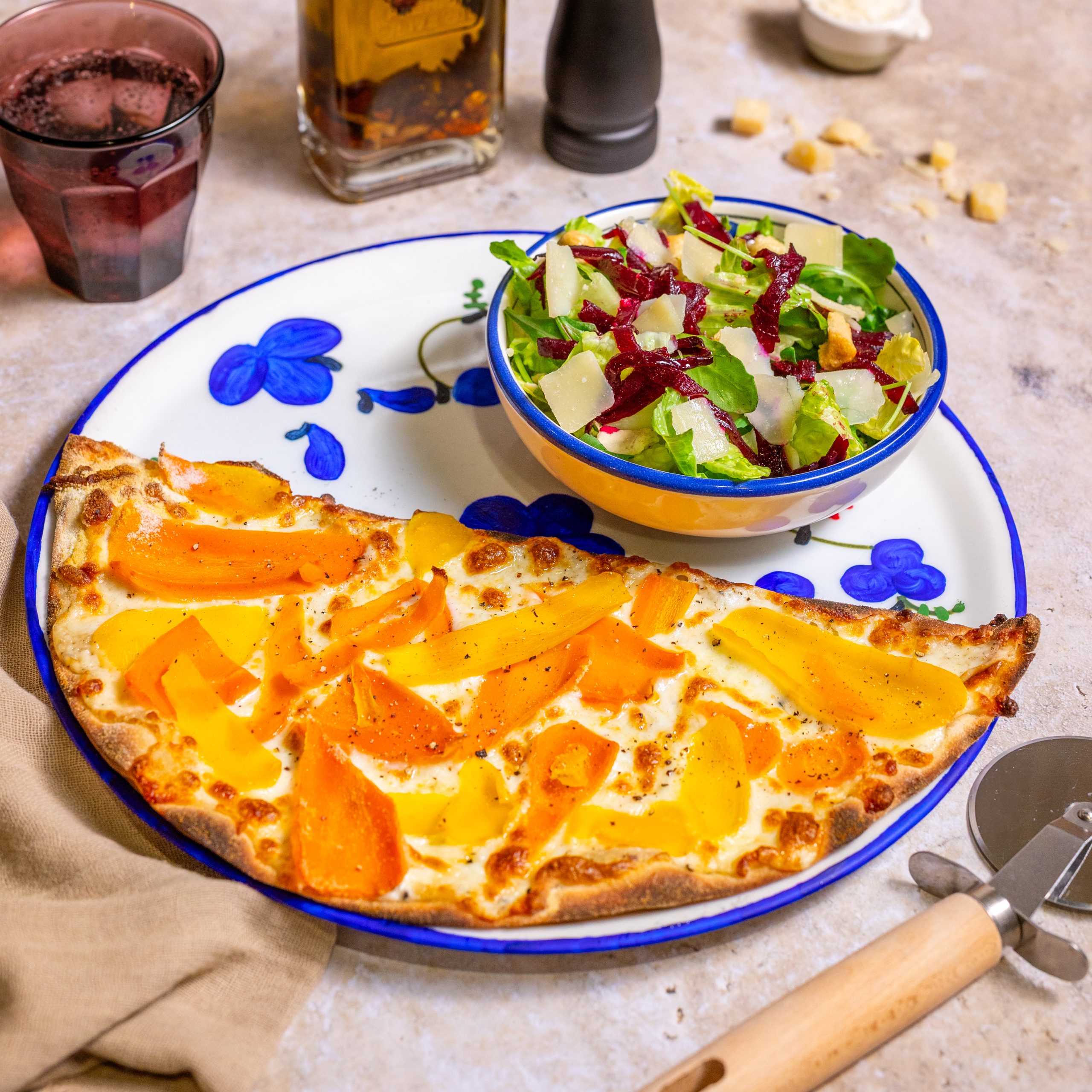 Crème Signorizza Genovese, mozzarella, carottes bicolores, quartiers de tomates confites, champignons italiens (cèpes, bolets…), pickles d’oignon rouge, oignons confits, origan. Après cuisson : Pesto genovese, biscuits salés italiens taralli.