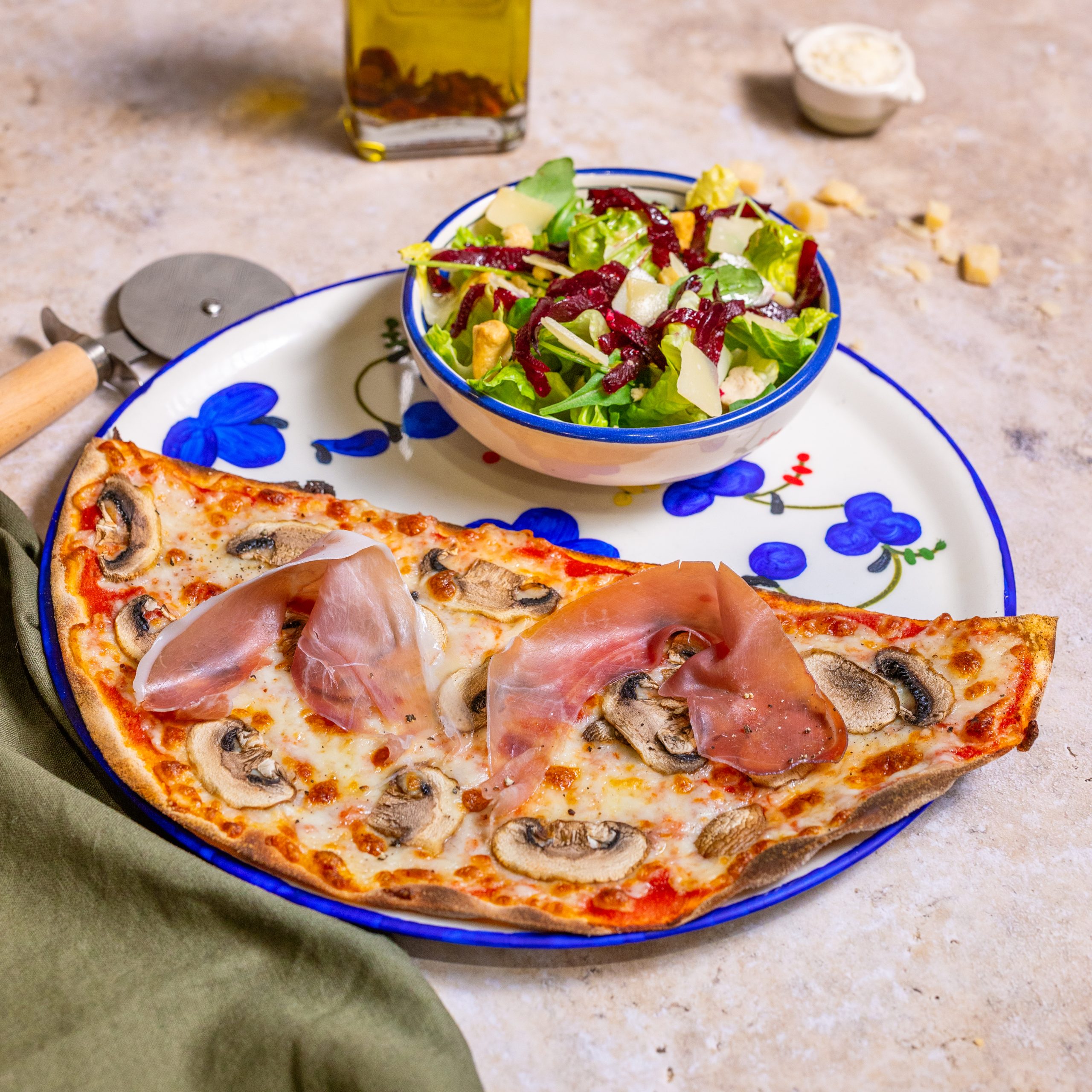 Sauce tomate italienne, mozzarella, fromage frais stracciatella, spianata*, champignons italiens (cèpes, bolets…), quartiers de champignons Portobello, parmigiano reggiano D.O.P., basilic frais, origan. origan. Servie avec une salade verte assaisonnée.