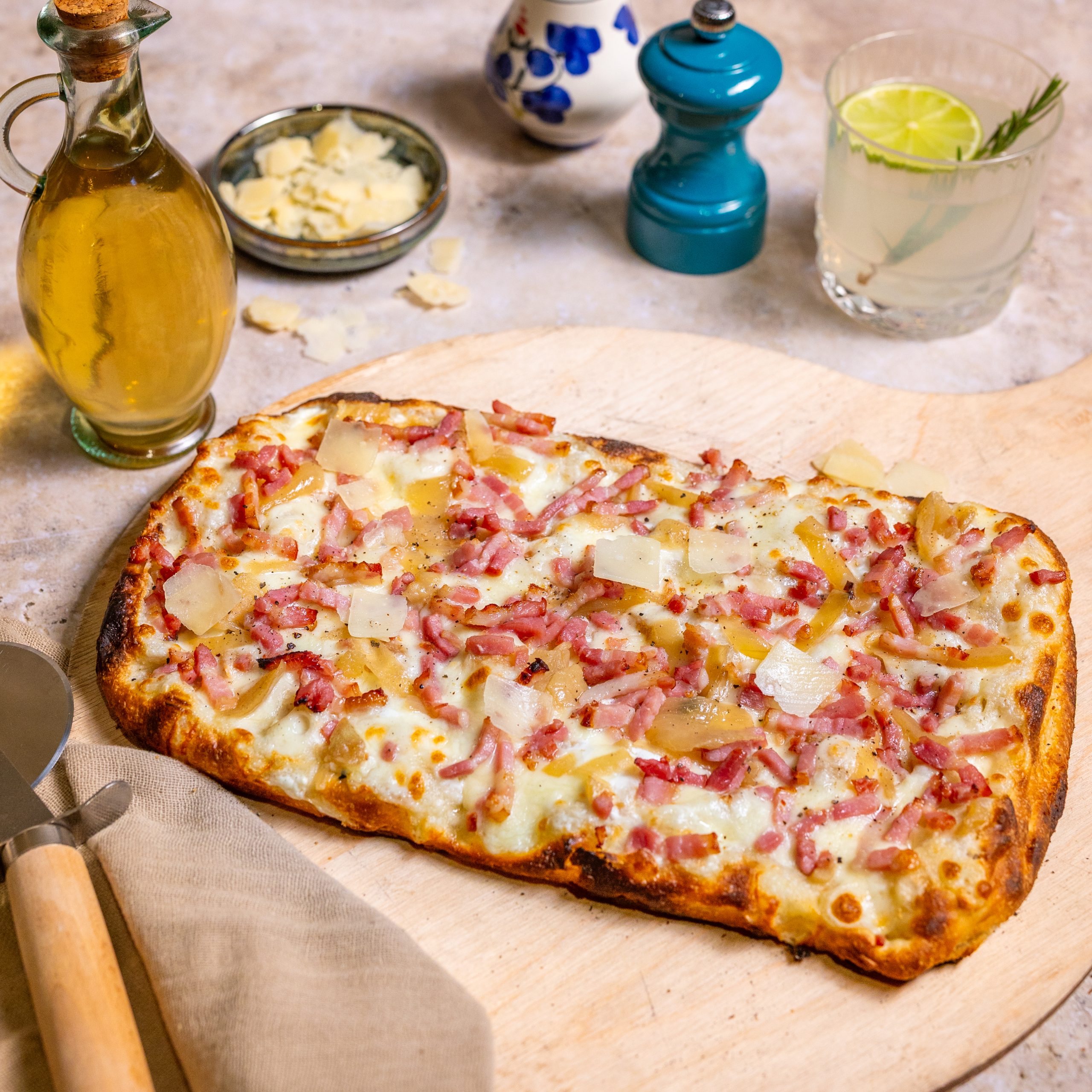 Crème fraîche moutardée, mozzarella, lardons fumés, taleggio D.O.P.*, champignons émincés, oignons confits, origan.