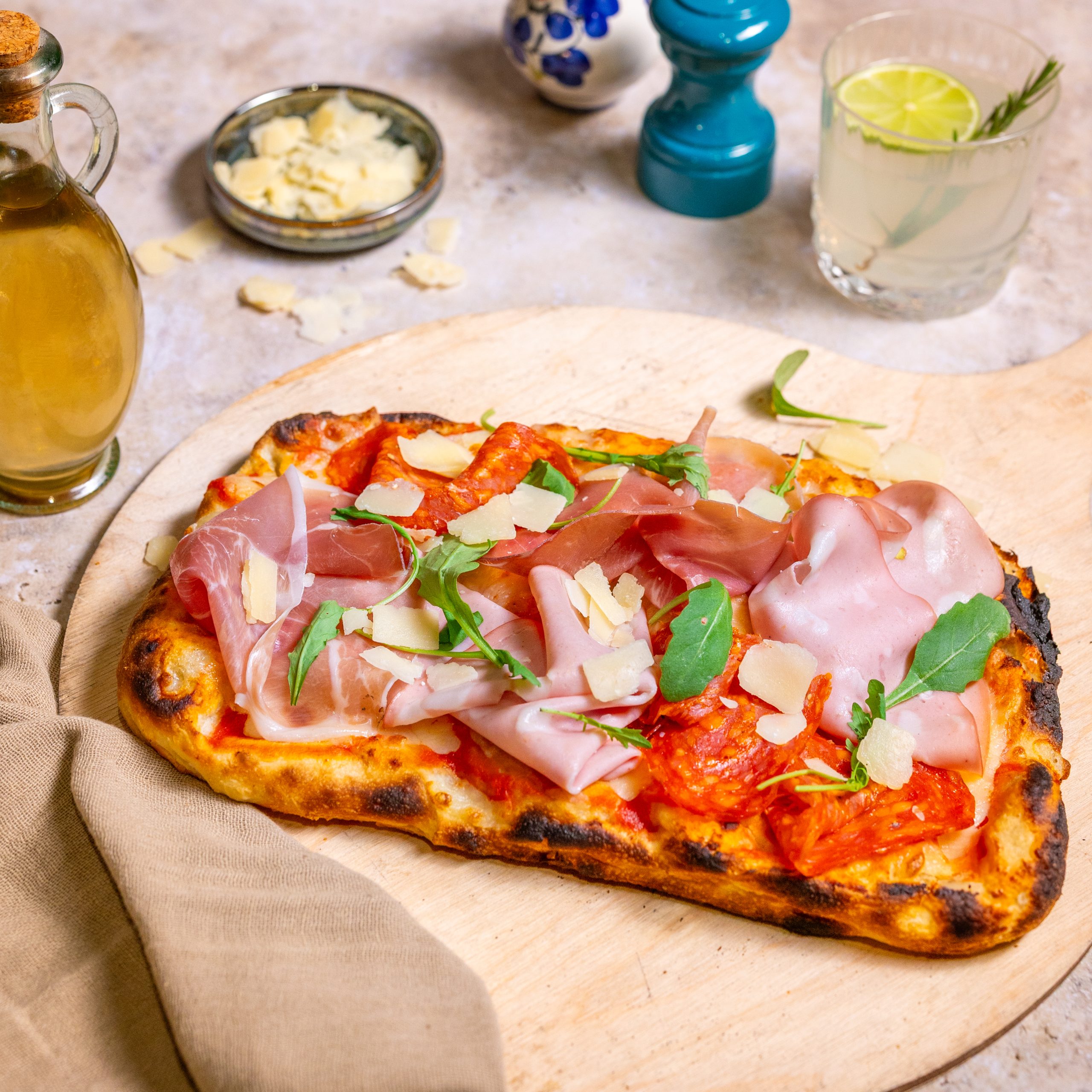 Sauce tomate italienne, mozzarella. Après cuisson : jambon cru affiné italien, spianata*, mortadelle de Bologne*, copeaux de parmigiano reggiano D.O.P., roquette.