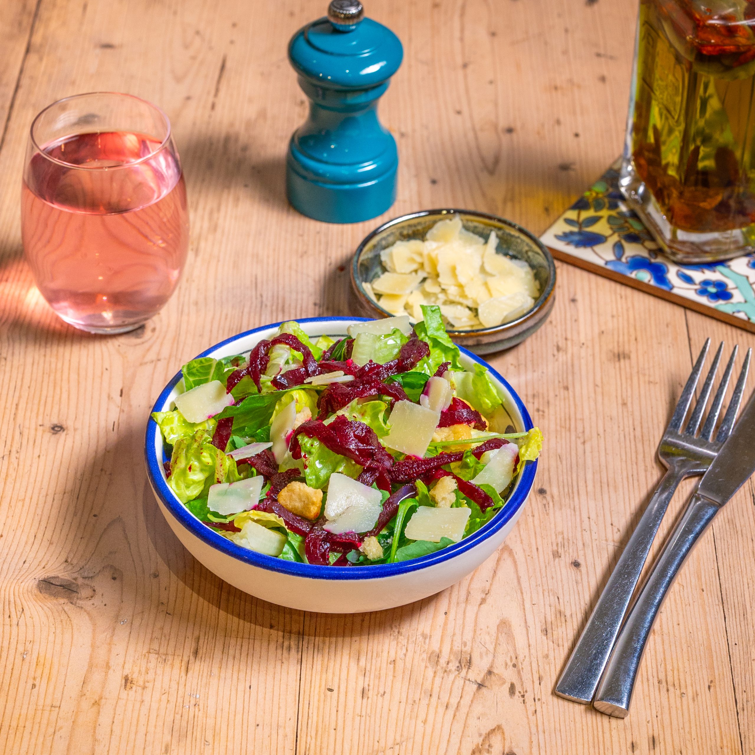 Salade romaine extra croquante et roquette, julienne de betteraves fondantes, copeaux de parmigiano reggiano D.O.P., biscuits salés italiens taralli, vinaigrette de balsamique blanc.