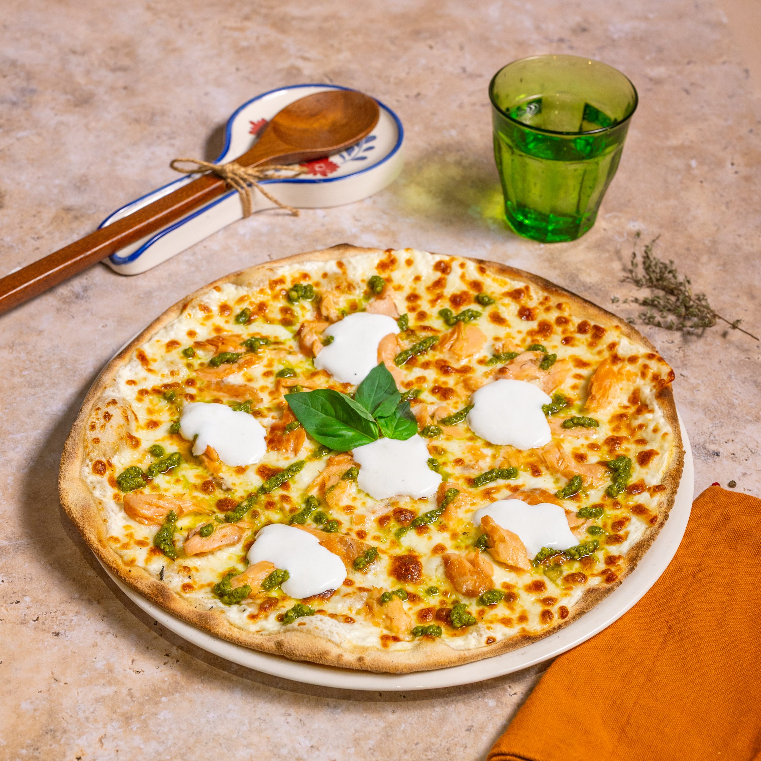 Crème Signorizza Genovese, mozzarella, saumon cuit fumé, champignons italiens (cèpes, bolets…) et basilic frais.