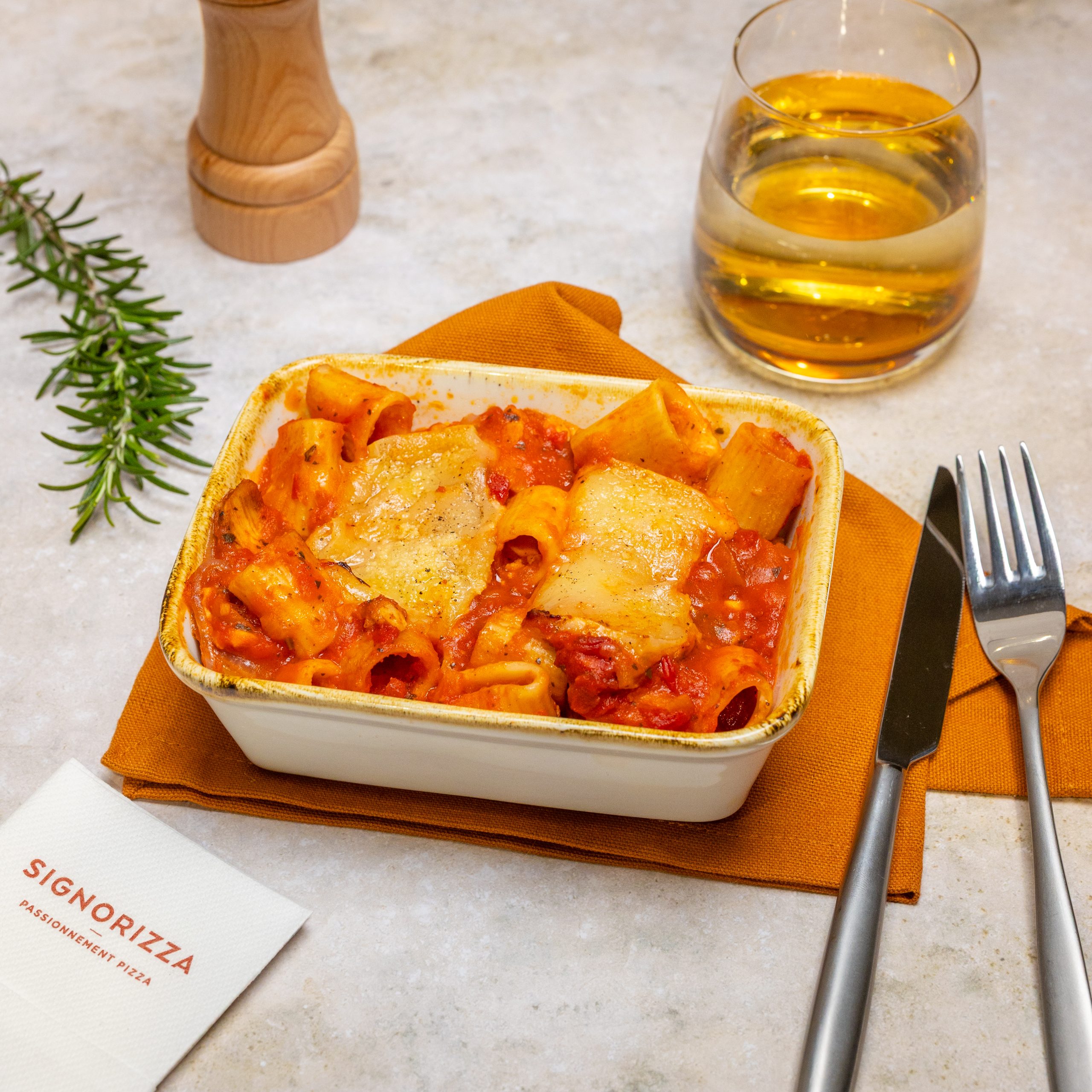 Lasagnes généreuses garnies de sauce napolitaine, viande de boeuf française mitonnée, béchamel, mozzarella, basilic frais.
